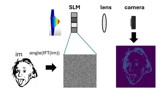 Previously, we saw that in the far field of an image, most of the information is contained in the phases. Therefore, if we want a camera to display an image of Einstein, we can place an SLM in the far field and load onto it the phases obtained from the Fourier transform of Einstein’s image. Although the laser illuminating the SLM will typically have a Gaussian profile, as we learned, phase is more important than amplitude. This simple method already works quite well (see illustration below), but we can do even better!